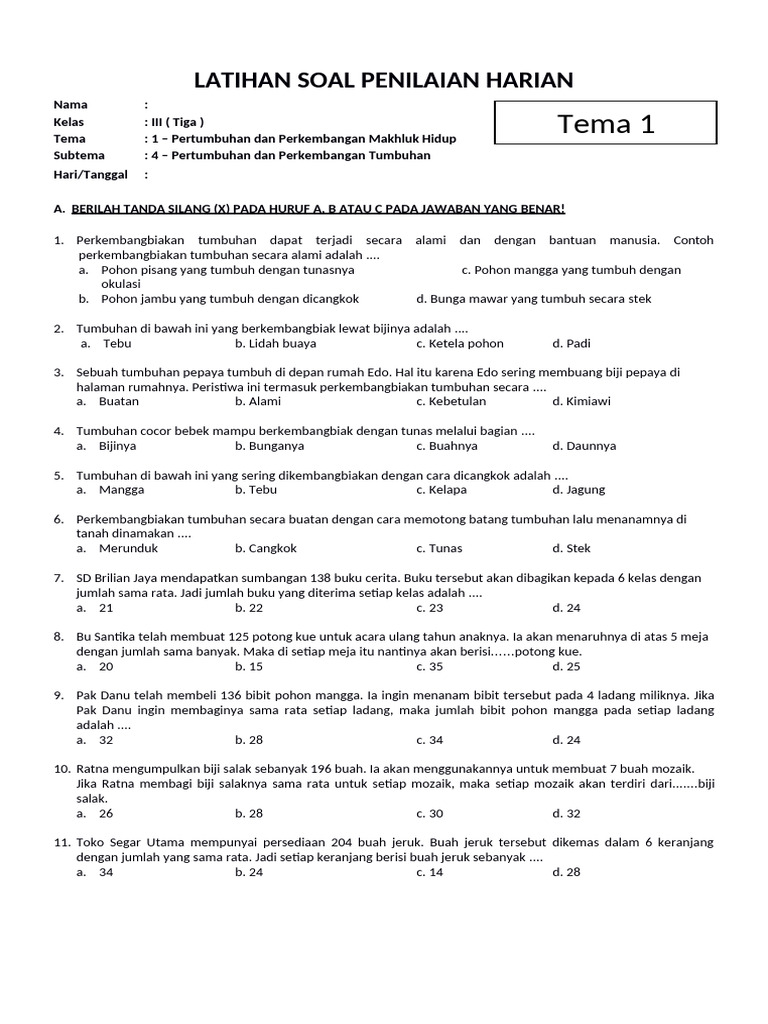 - Soal yang Menarik dan Kontekstual: Soal-soal dirancang agar menarik dan relevan dengan kehidupan sehari-hari siswa. Penggunaan contoh-contoh konkret dan cerita yang dekat dengan dunia anak membuat proses belajar menjadi lebih menyenangkan dan mudah dipahami. Misalnya, dalam tema pertumbuhan, soal bisa dikaitkan dengan pertumbuhan tanaman di halaman rumah atau perkembangan hewan peliharaan.