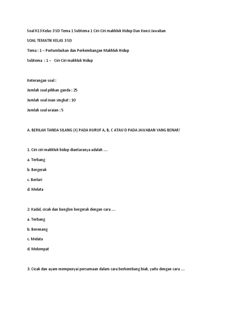 Memahami ciri-ciri makhluk hidup bukan sekadar hafalan, melainkan sebuah proses observasi, identifikasi, dan penalaran. Melalui berbagai jenis soal yang dirancang sesuai K13, siswa diajak untuk aktif berpikir dan mengaplikasikan pengetahuan mereka. Artikel ini akan mengupas tuntas berbagai tipe soal yang sering muncul pada Tema 1 Subtema 1 Kelas 3 SD, dilengkapi dengan contoh-contoh soal yang relevan dan strategi menjawabnya, sehingga diharapkan dapat menjadi panduan berharga bagi guru, orang tua, dan tentu saja, para siswa.
